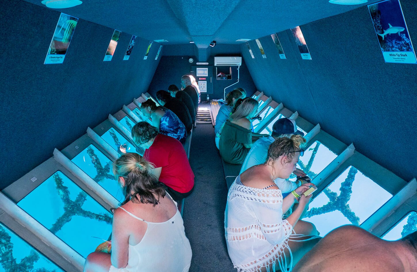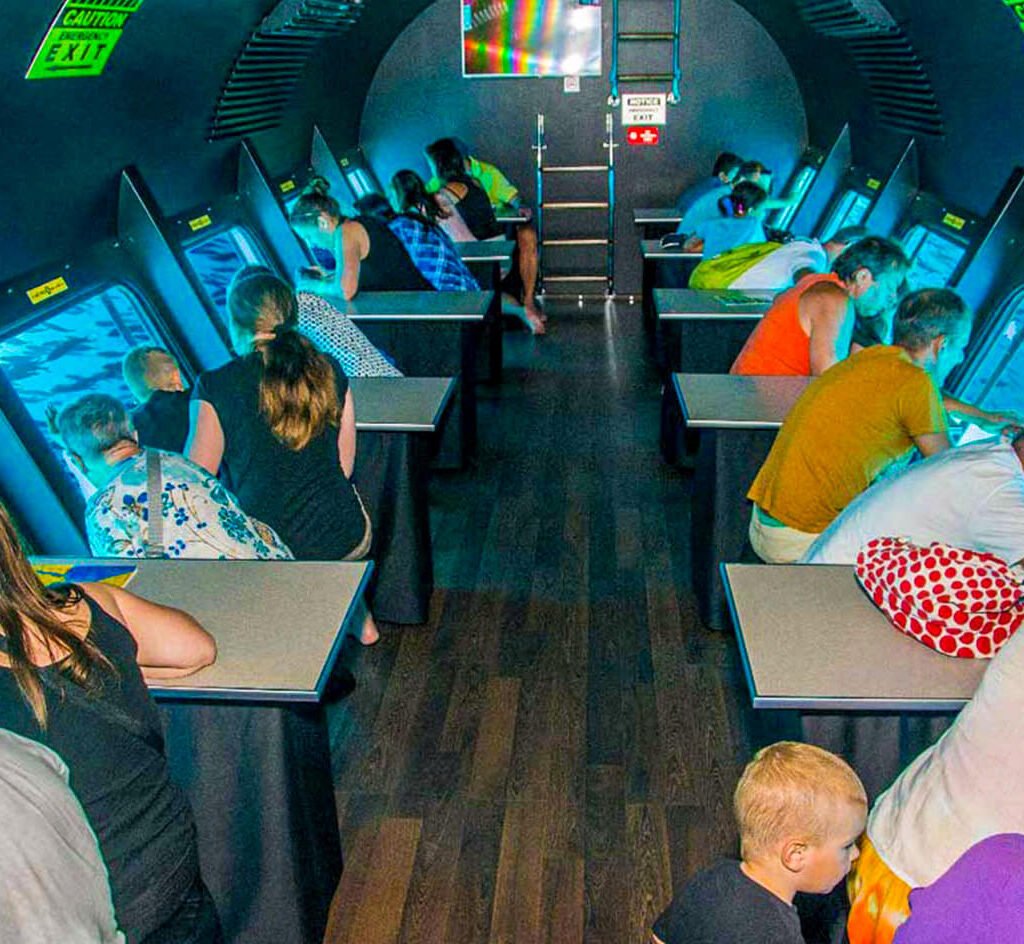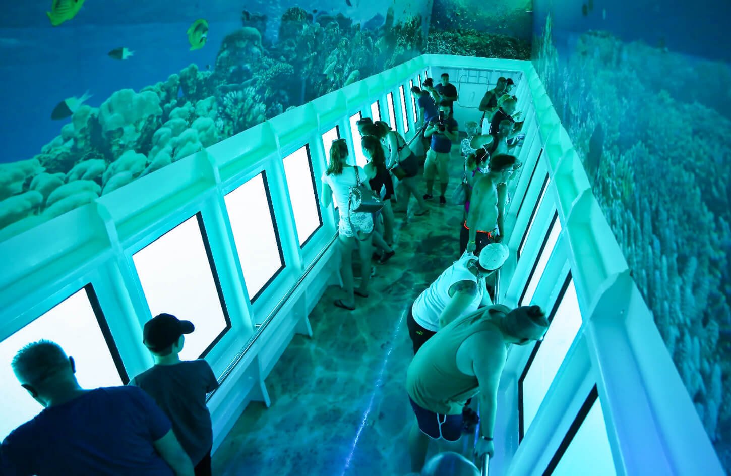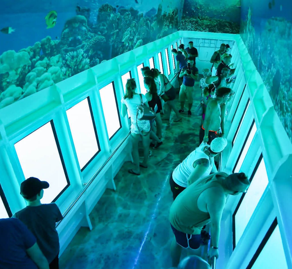 À travers de larges fenêtres panoramiques, vous profiterez d’une vue ininterrompue sur les jardins de coraux colorés, les bancs de poissons tropicaux et toute une série de créatures marines fascinantes, le tout juste sous la surface. C’est une excursion idéale pour les familles, les couples et tous ceux qui préfèrent ne pas faire de plongée avec tuba ou de plongée sous-marine, car elle permet de découvrir la beauté naturelle de la mer Rouge en toute tranquillité.