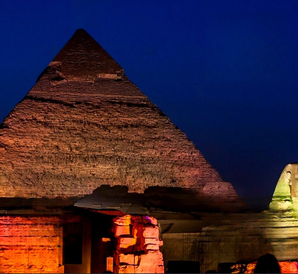 La soirée commence par une visite du plateau de Gizeh, où les légendaires pyramides de Gizeh et le Grand Sphinx prennent vie dans un spectacle son et lumière envoûtant. À la tombée de la nuit, des lumières éblouissantes illuminent les monuments anciens tandis qu’une narration puissante raconte l’histoire, les mythes et les secrets des pharaons qui ont construit ces structures emblématiques.