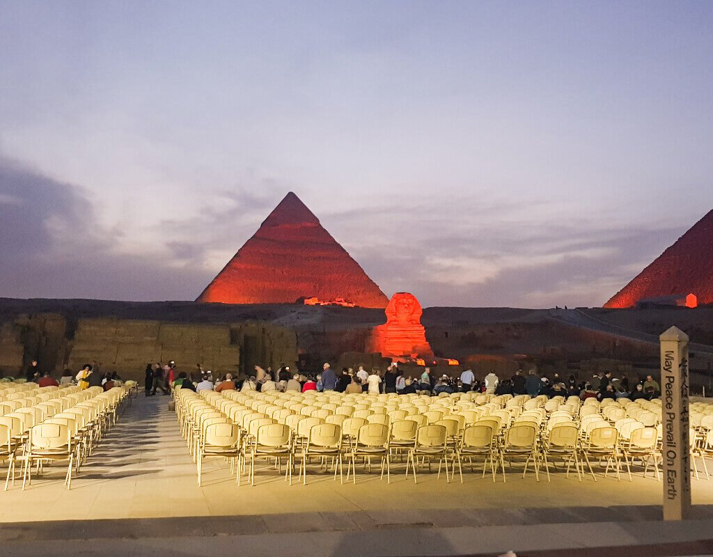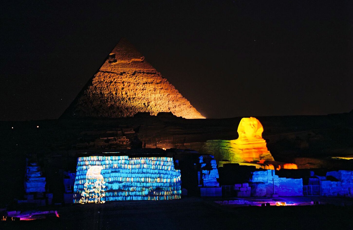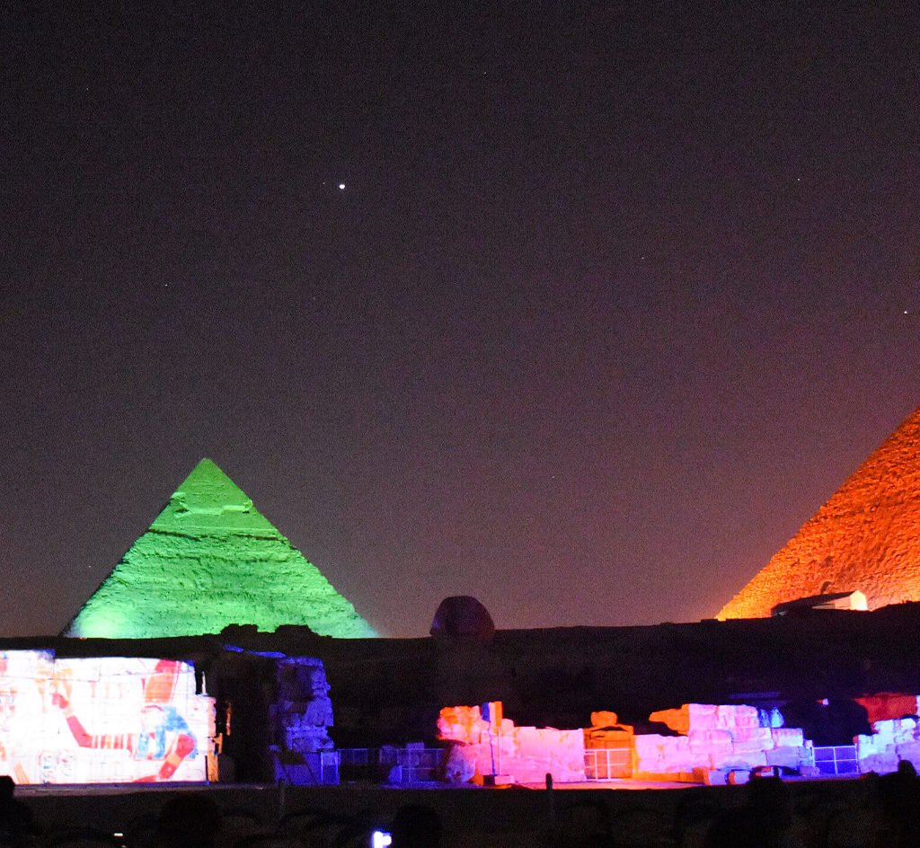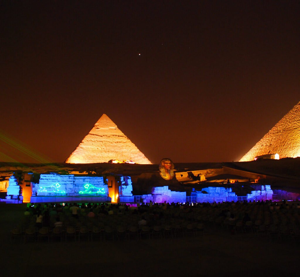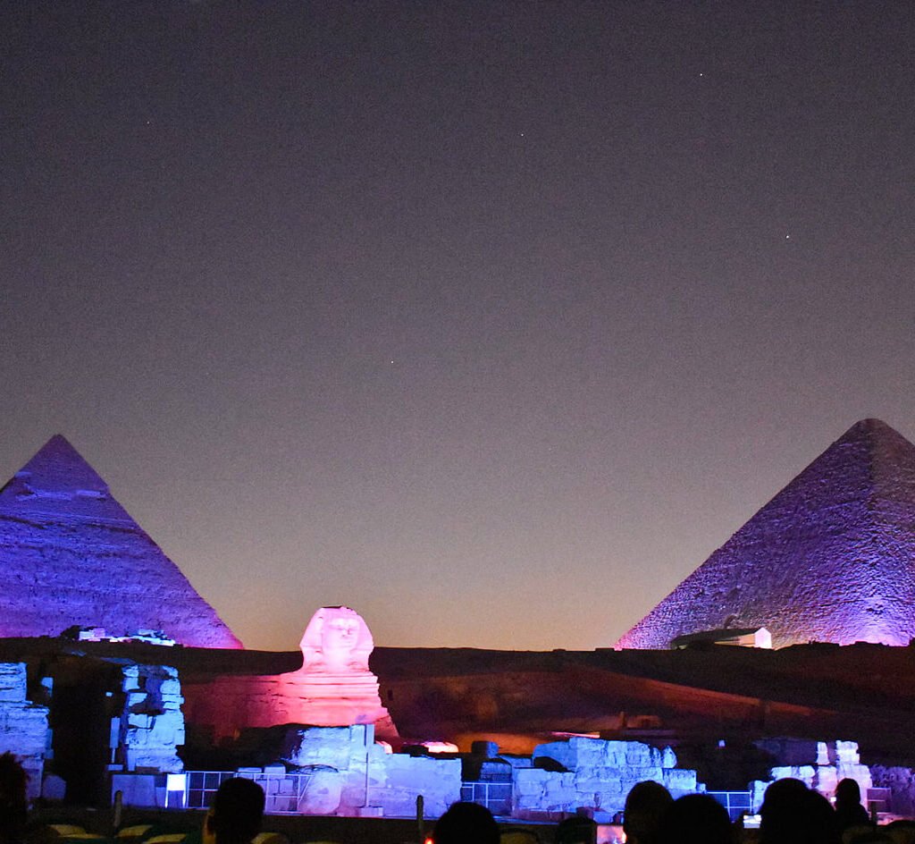 Vivez la magie des merveilles antiques de l’Égypte lors du Spectacle Son et Lumière des Pyramides. À la tombée de la nuit, les Pyramides de Gizeh et le Grand Sphinx s’illuminent de lumières éclatantes, donnant vie à leur histoire légendaire. Grâce à une narration captivante et à des effets visuels saisissants, écoutez les récits des pharaons et découvrez les secrets de ces monuments emblématiques. Cette soirée inoubliable offre une manière unique d’admirer la splendeur des pyramides sous les étoiles.